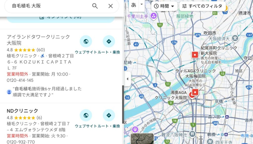 一方、Googleマップの口コミは、実際にカウンセリングや自毛植毛を受けた人の体験談です。対応の丁寧さ、無理な勧誘の有無、術後フォロー、院内の清潔さなど、公式サイトでは分からないリアルな情報を得られます。