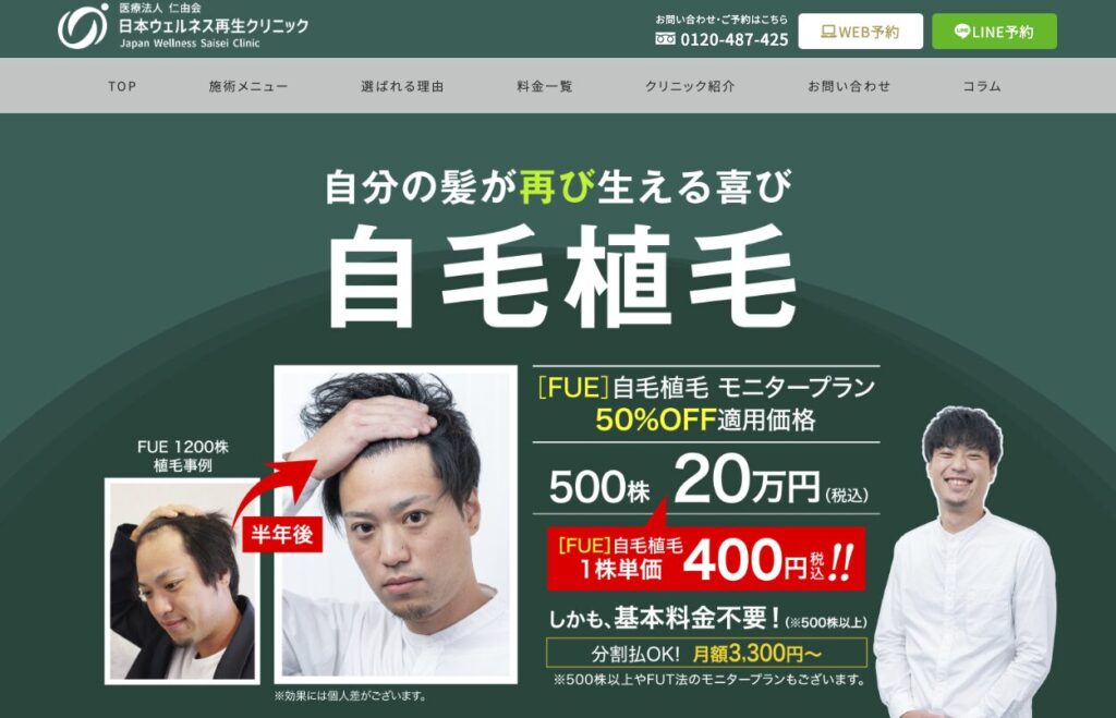 日本ウェルネス再生クリニック大阪院は、20年以上のキャリアを持つ院長・山本先生と自毛植毛の専門チームが施術を担当する信頼度の高いクリニックです。関西圏だけでなく関東からも指名が入るほど、経験と技術に裏打ちされた実績があります。